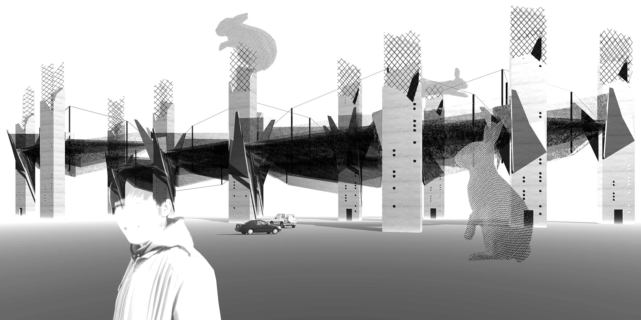 Welcome to a parking lot in Los Angeles—or wait—welcome to P-aradise, a suspended topiary high-end residence planted into a parking lot grid. The structure appears to float and rabbits jump into the air. Master’s thesis project by Lia Maston, with advisors Professors Georges Teyssot and Myriam Blais at the architecture school at Laval University in Quebec City. Inspired by the geometry of waves, and bunnies.